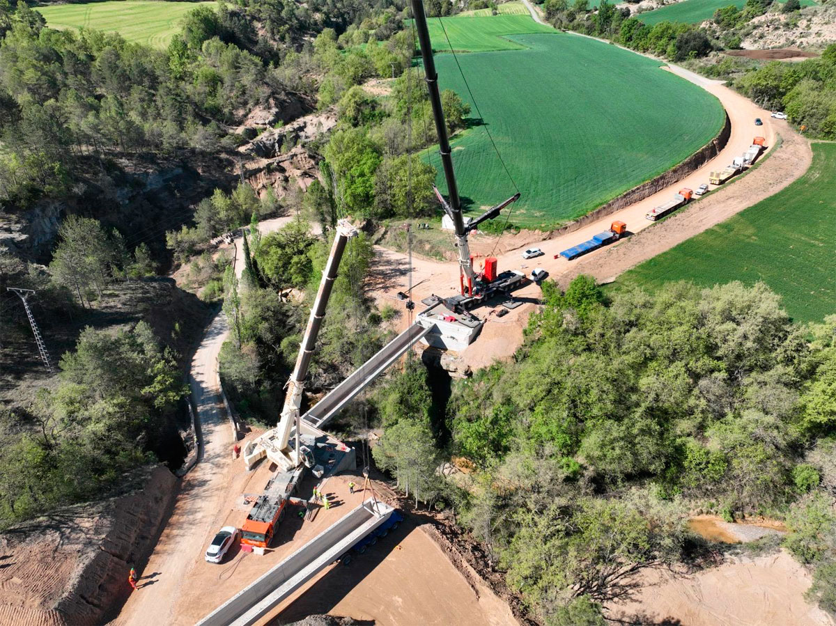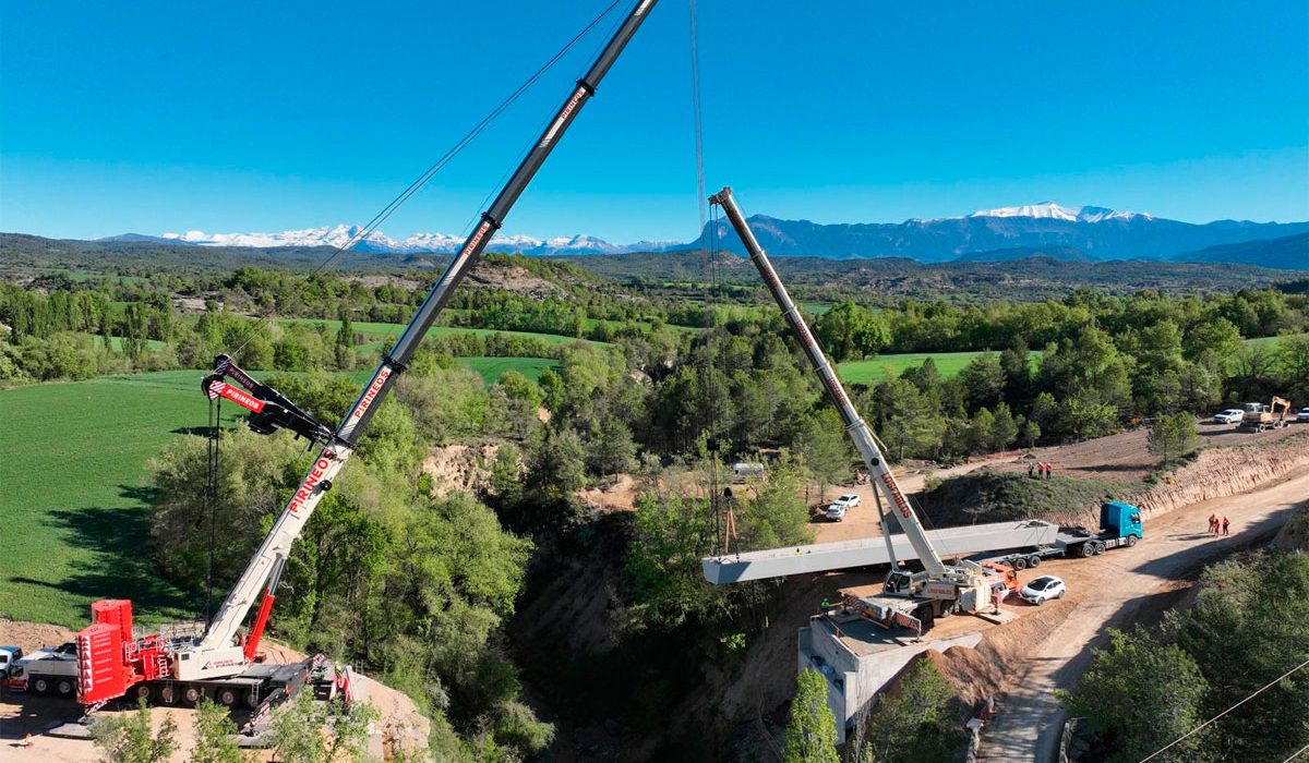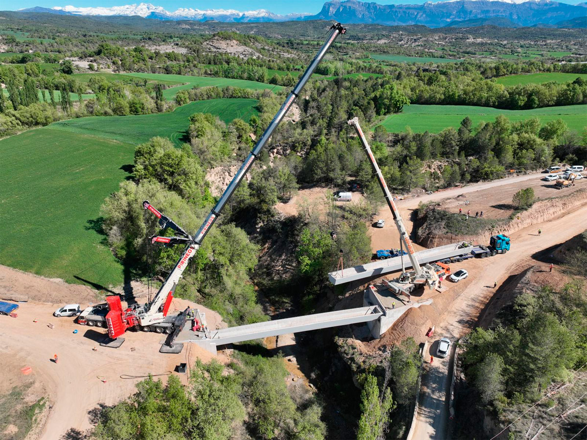 Colocación de viga para construcción de puente sobre el río Susía en Lamata (Huesca), cerca de Abizanda, en la comarca del Sobrarbe, para lo que han sido necesarias 2 grúas de gran tonelaje, la Liebherr LTM 1650 – 8.1 de 700 toneladas, y la Liebherr LTM 1300 – 6.2 de 300 toneladas, siendo necesarios 6 conjuntos de camión con remolque para llevar los contrapesos utilizados en esta obra.