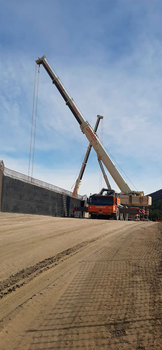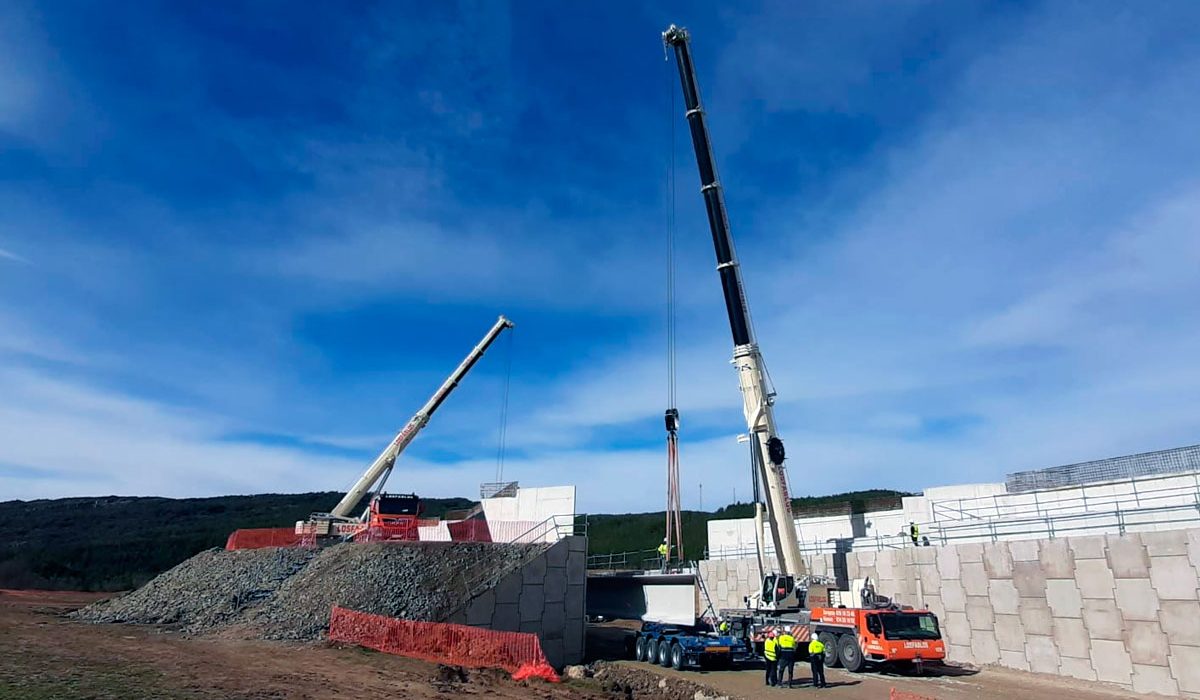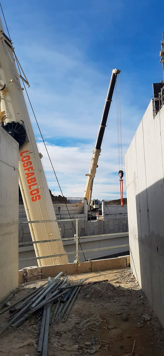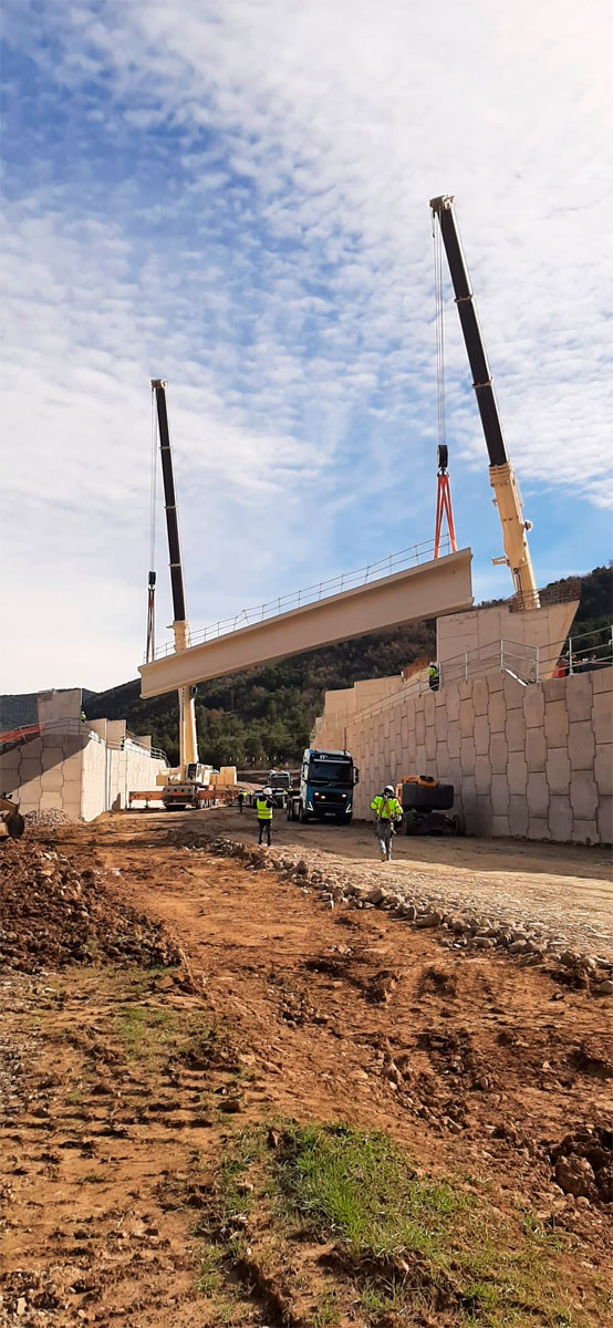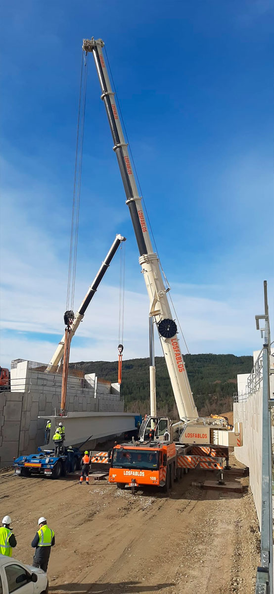 Actuación de nuestras grúas en las obras de la Autovía A-23 a la altura de Hostal de Ipiés (Huesca), con la participación de una Grúa Liebherr LTM 1300 – 6.2 de 300 toneladas y una Grúa Liebherr LTM 1220 – 5.2 de 220 toneladas para el movimiento de vigas.