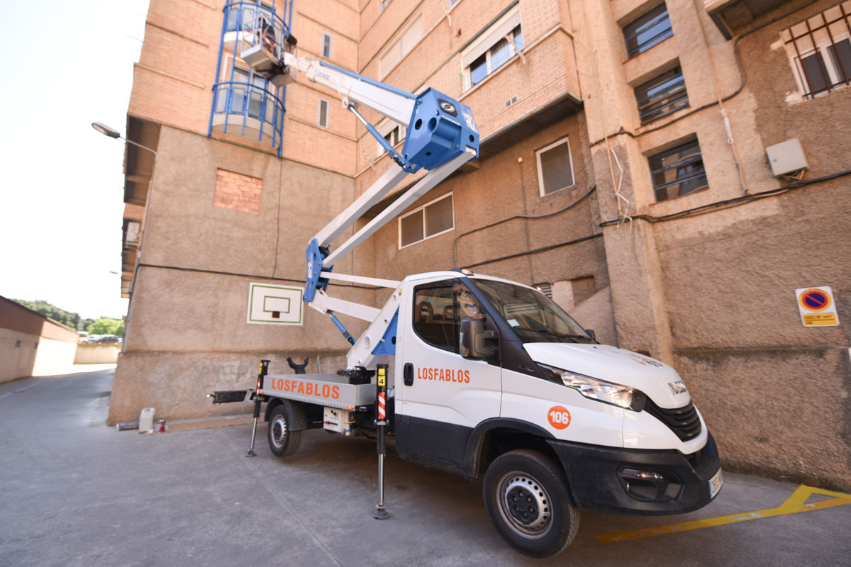 Alquiler de camión cesta con elevador hasta 24 metros para realizar acciones de reparación y mantenimiento en altura en un edificio de Huesca. Grúas Losfablos alquila estos camiones cesta sin conductor.