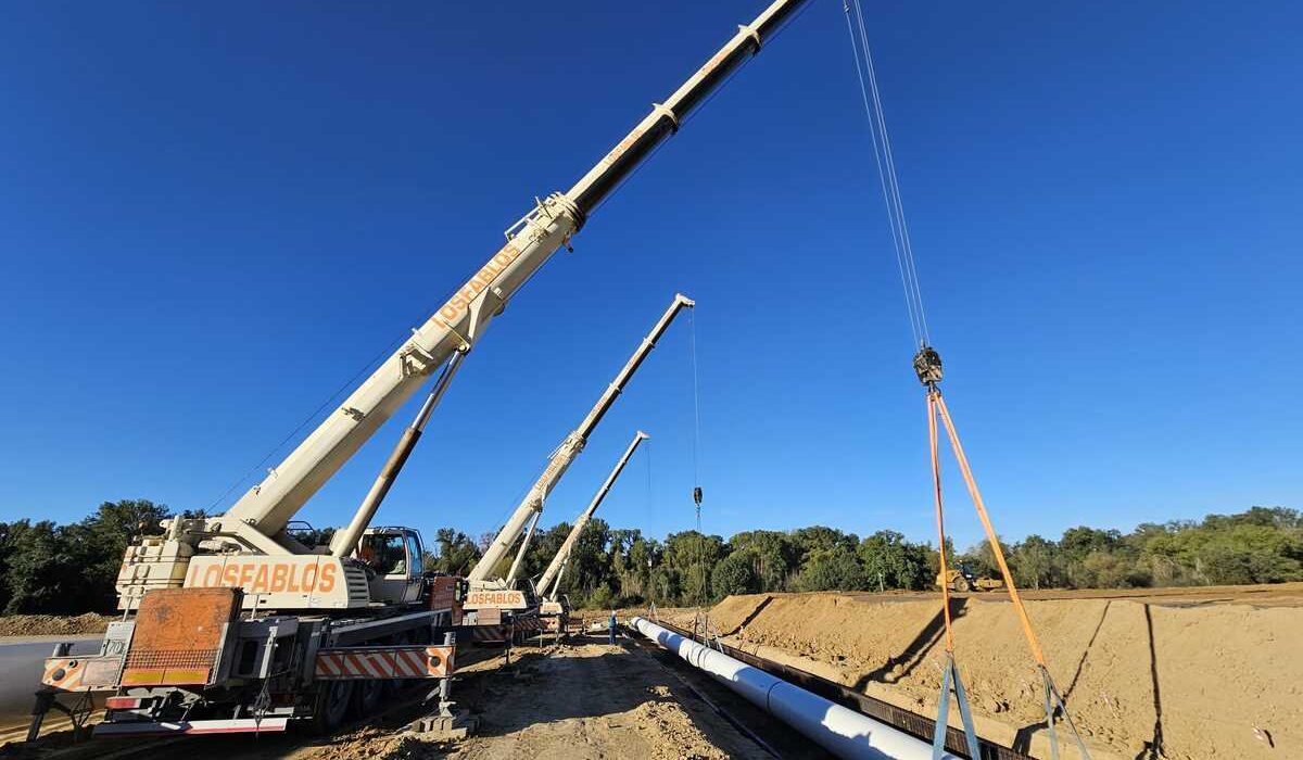 Descarga sincronizada de tubo de grandes dimensiones en Huesca con tres de nuestras grúas autopropulsadas LIEBHERR, perfectas para este tipo de trabajos.